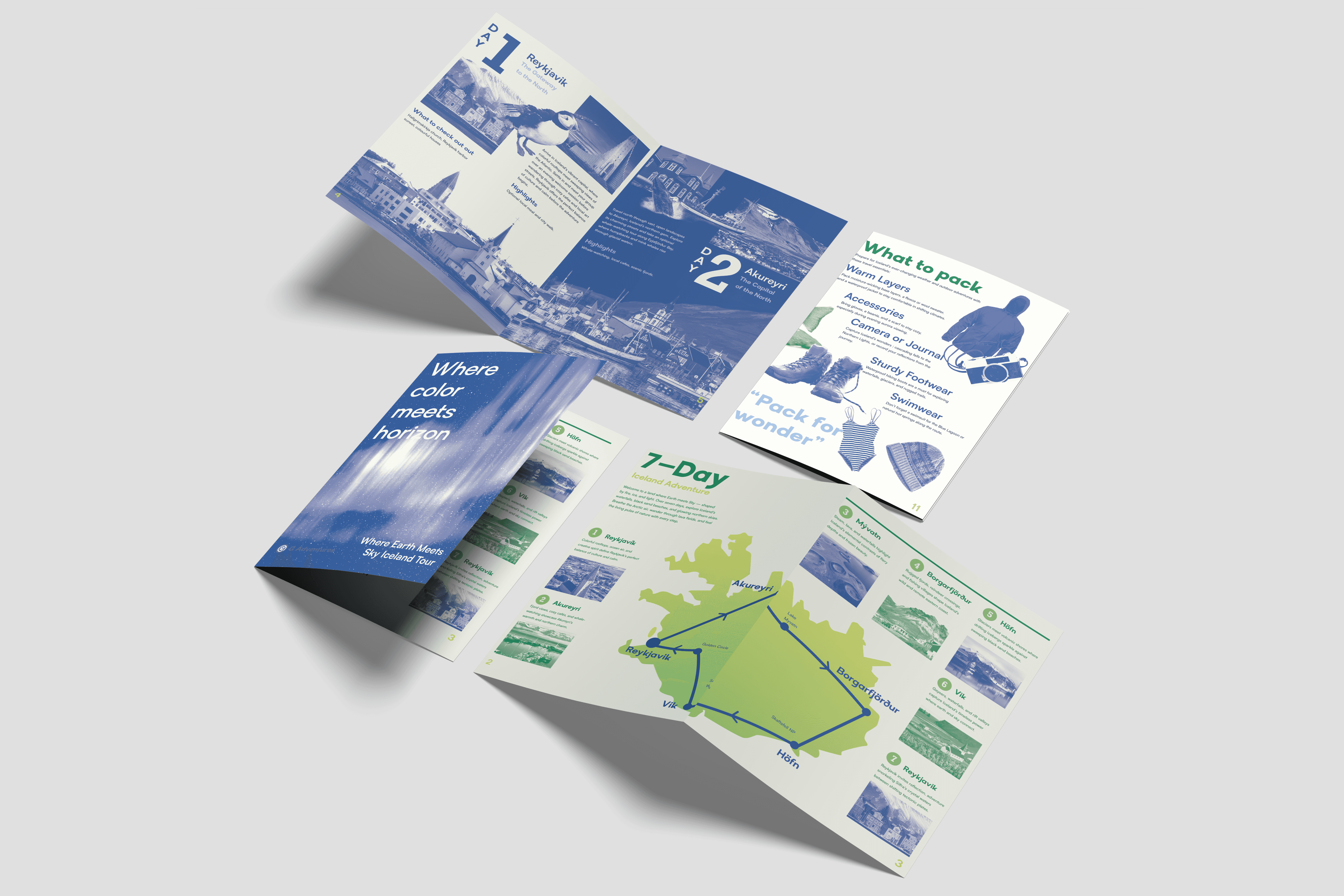 G Adventures offers diverse travel itineraries, but lacked a brochure that visually captured the experience of each destination. Where Earth Meets Sky was created as an immersive Iceland travel brochure inspired by its breathtaking landscapes and Northern Lights, using a blue and green palette with monochrome imagery to create a clean, modern magazine-style aesthetic.