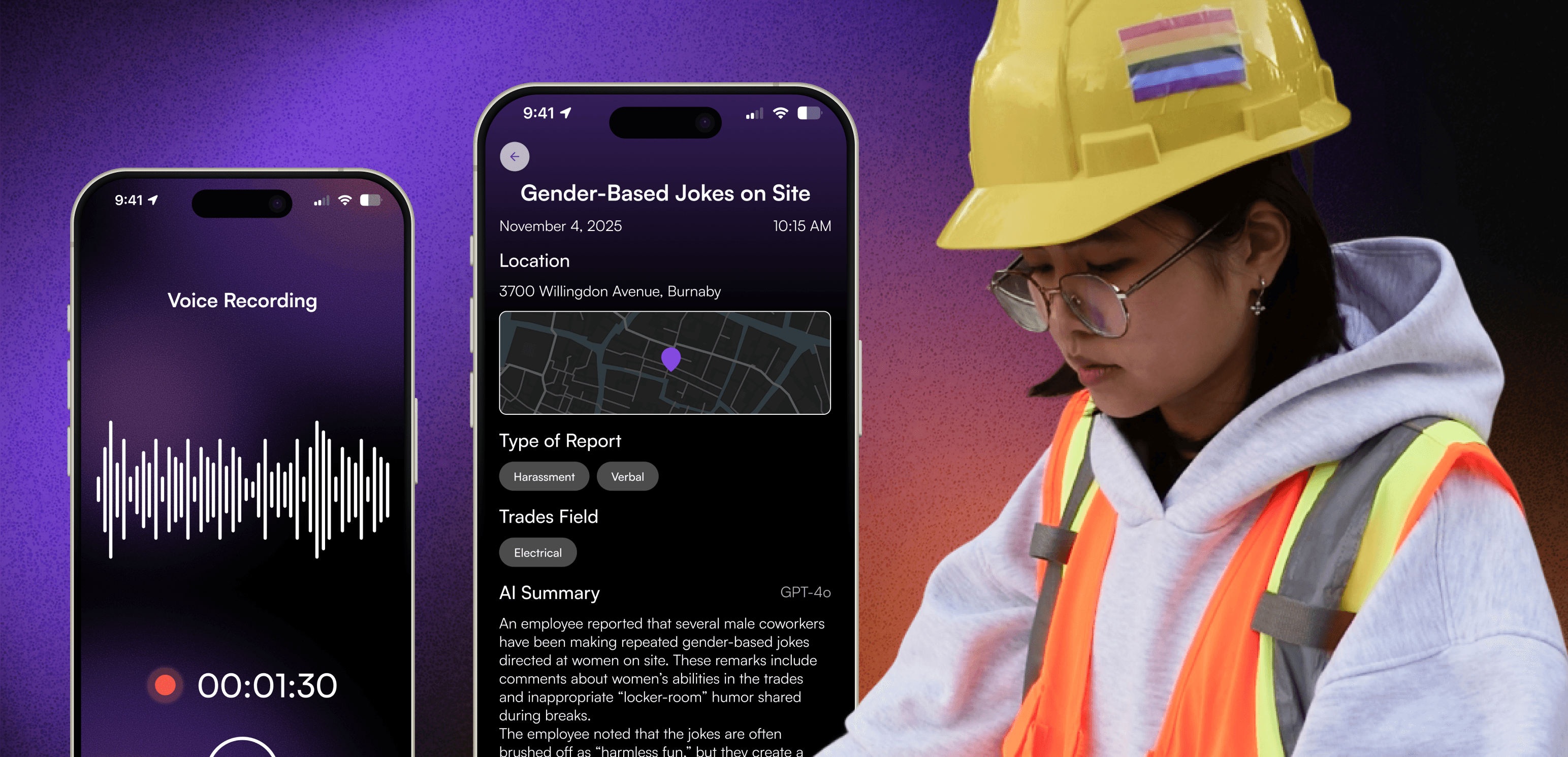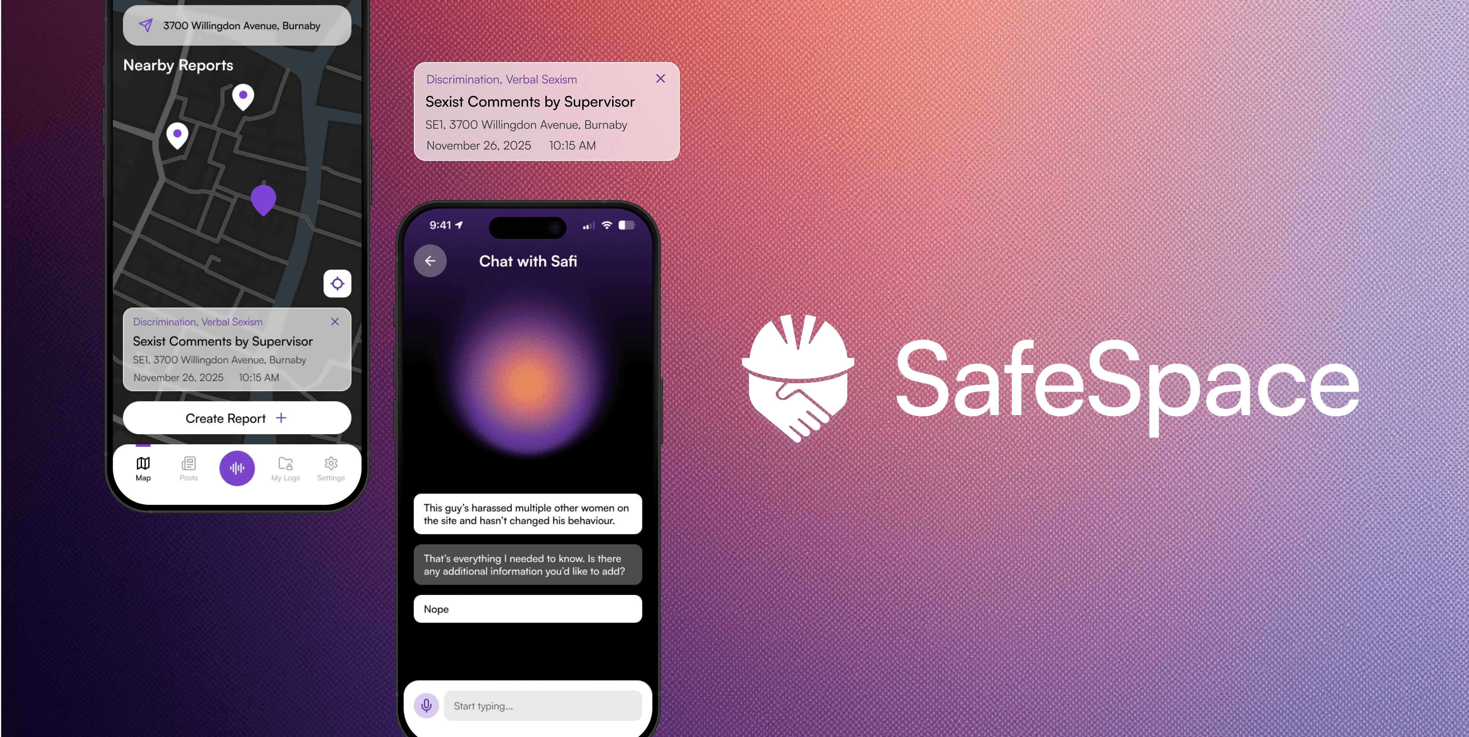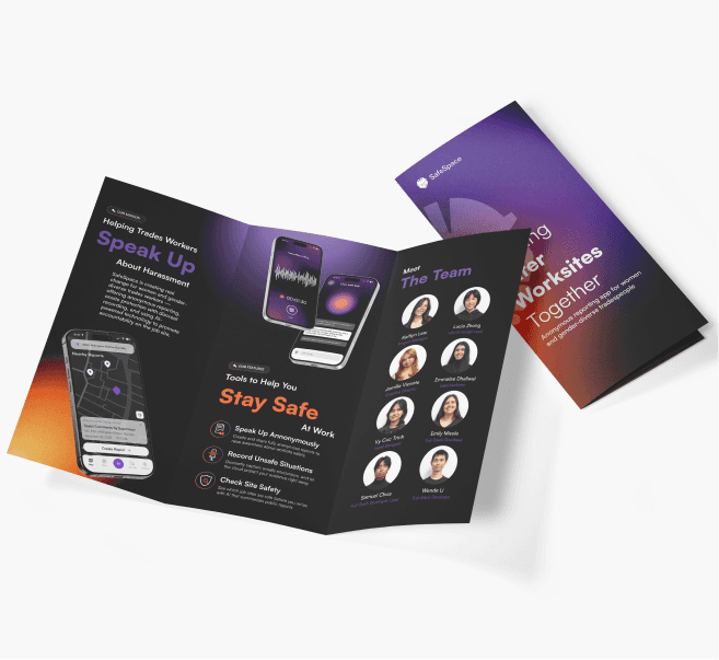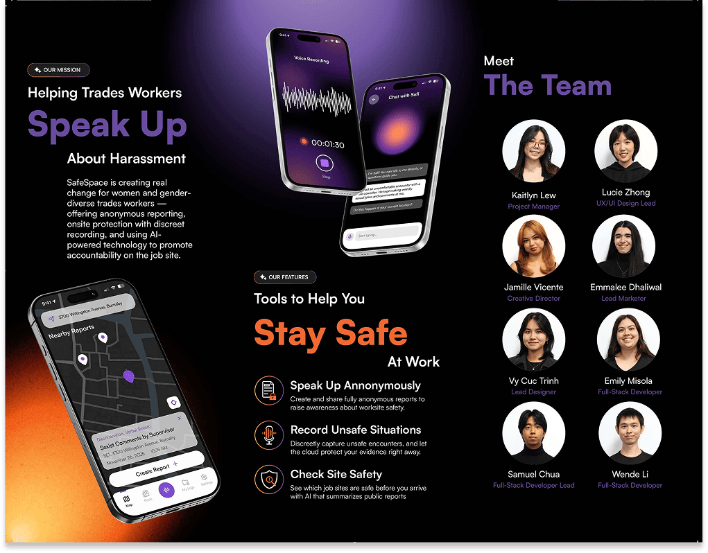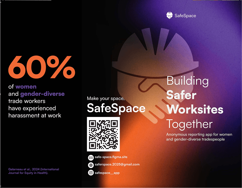 SafeSpace is an app designed to help women and gender-diverse workers in trades safely document workplace harm, access support, and build awareness. Using AI, the platform transforms anonymous reports into clear insights and actionable steps to improve job site safety.