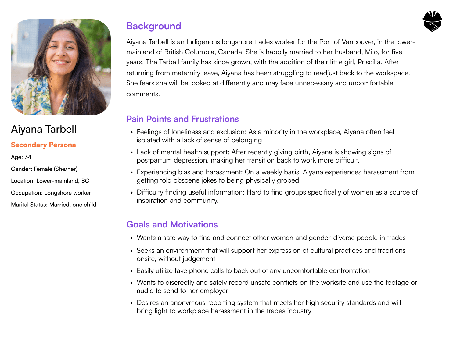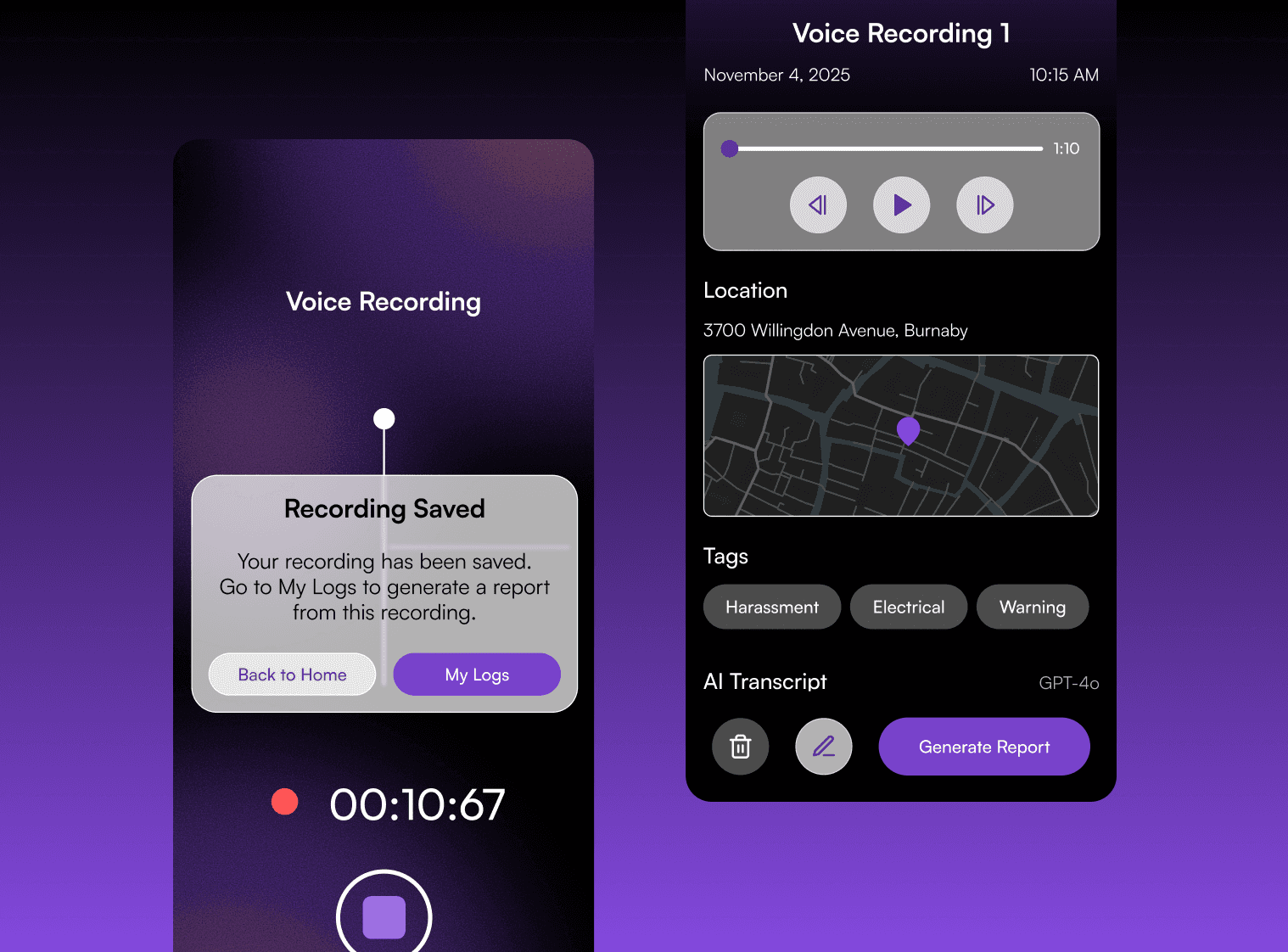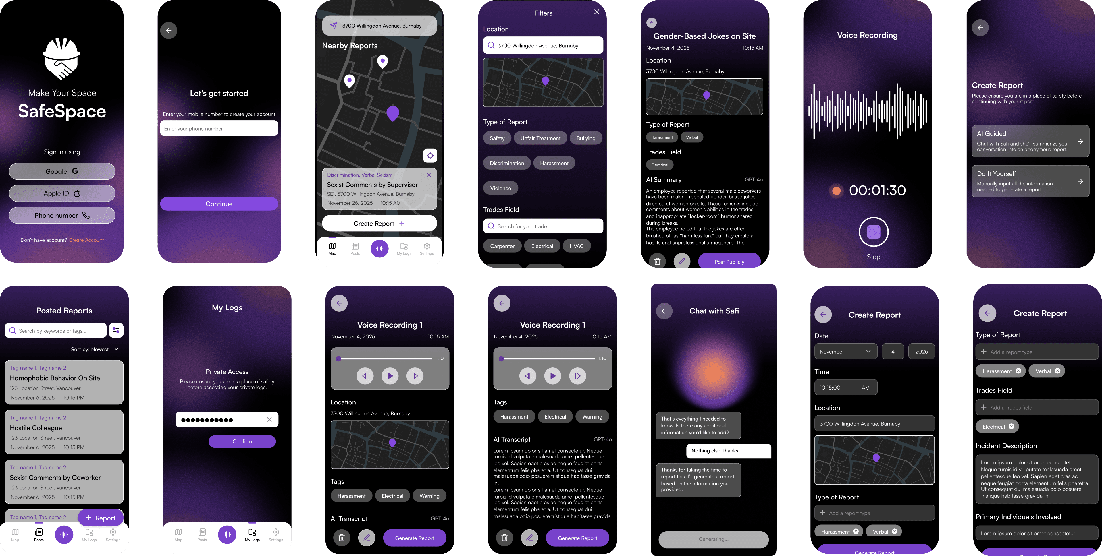 SafeSpace is an app designed to help women and gender-diverse workers in trades safely document workplace harm, access support, and build awareness. Using AI, the platform transforms anonymous reports into clear insights and actionable steps to improve job site safety.