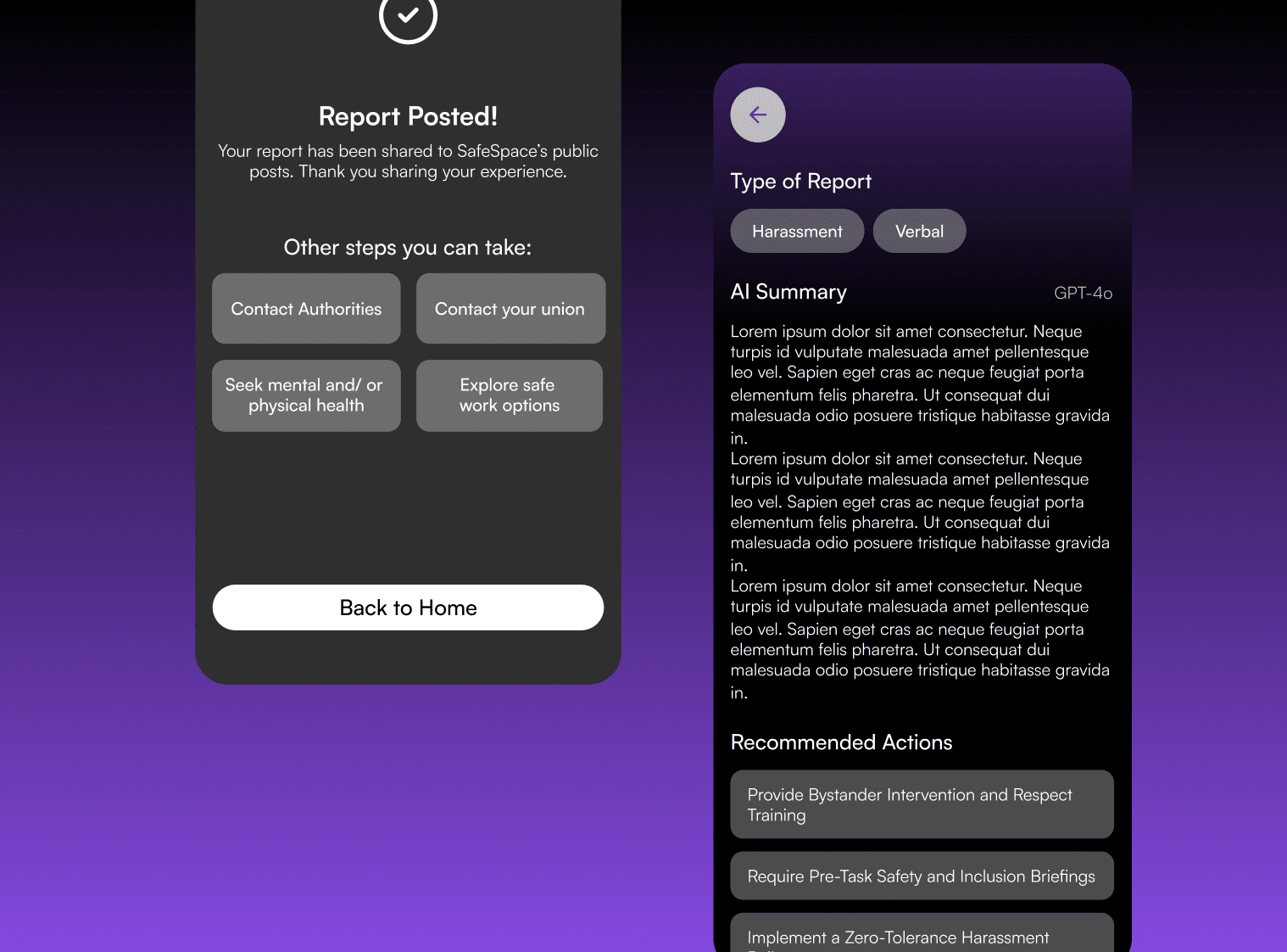 SafeSpace grew from a small idea into a fully realized product through research, iteration, and a shared commitment to creating safer workplaces. Leading the design of this project deepened my understanding of how thoughtful, intentional design can support and protect communities.